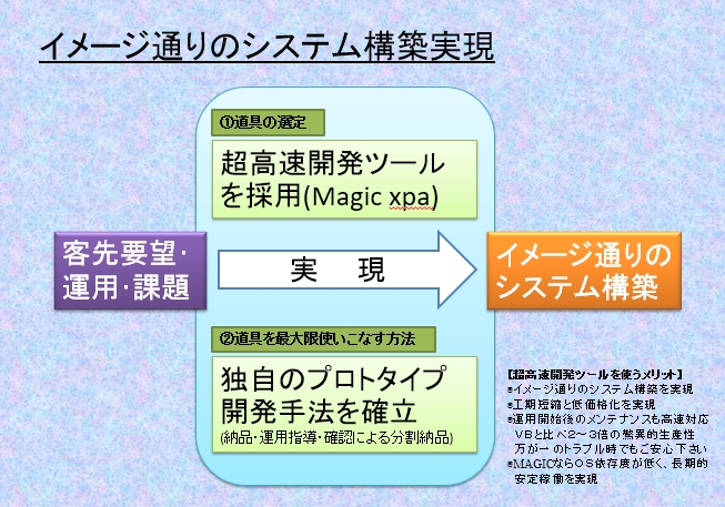 当社では、”驚異的な生産性を誇る超高速開発ツールの採用”と、”独自のプロトタイプ開発手法”により、客先の問題点・課題点を解決し、分かりやすい(操作性の良い)システム創りを行っています。全国には競合他社はたくさんありますが、当社がプレゼンを行った客先での成約率は60%を超えています。