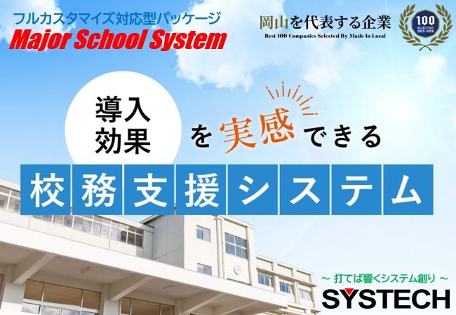 1991年 システムソリューション事業部門として岡山支社を設立 2002年 高等学校向け成績管理システム(Major School System)を開発、販売開始。 2015年 システムソリューション事業部門がシステックITソリューション株式会社とし て独立。 2020年 経営者向け月刊誌『マスターズ』11月号に俳優の野村宏伸さんとの対談記事が 掲載されました。 2022年 校務支援システムに新たに保護者連携機能付きグループウェアをリリース。 2023年 SMBエクセレント企業賞を受賞しました。 (全国300万社中30社が受賞し、そのうち校務システム部門で当社が選ばれました) 2024年 SMBエクセレント企業賞を2年連続で受賞しました。 2025年 SMBエクセレント企業賞を3年連続で受賞しました。 2025年 『 BigLife21 』編集部が厳選する2025年注目のCEO30人に選出され『CEO Collection 2025』を受賞しました。 2025年 岡山県を代表する企業100選に選ばれました。 |