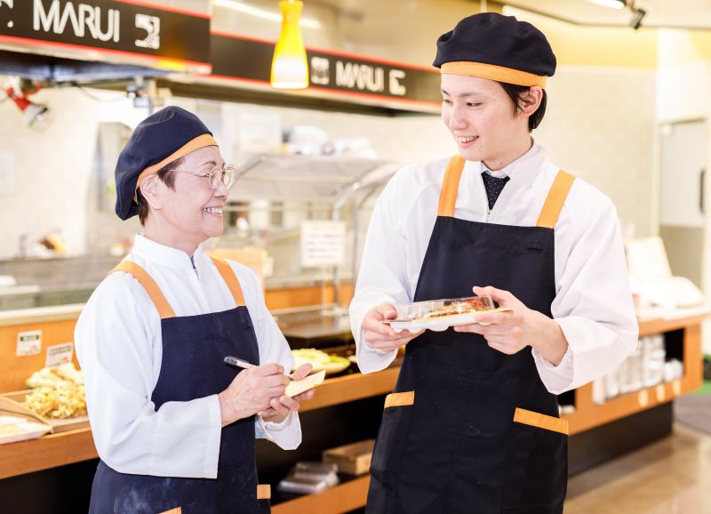 幅広い年齢層の方々がそれぞれのライフスタイルに合わせた働き方をしながらも、全員が一つのお店を作り上げるために、それぞれの立場からアイディアを出しながら仕事をに取り組みます。よりよいサービスを行うためには、働く社員のスキルアップが不可欠。社内に教育機関として「マルイアカデミー」を設立。「食の専門家」の育成をテーマに、能力・知識・接客力の向上を目指し、様々な研修、資格取得支援を導入しています。