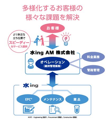 建設・普及の時代から、維持管理・更新の時代を迎えた今、官民連携による事業運営、改築・更新など、多様化するお客様のご要望に、より的確に、迅速にお応えするべく、水ingの一翼を担うオペレーション部門を組織拡充し、100%出資の水ingAM株式会社を設立しました。
