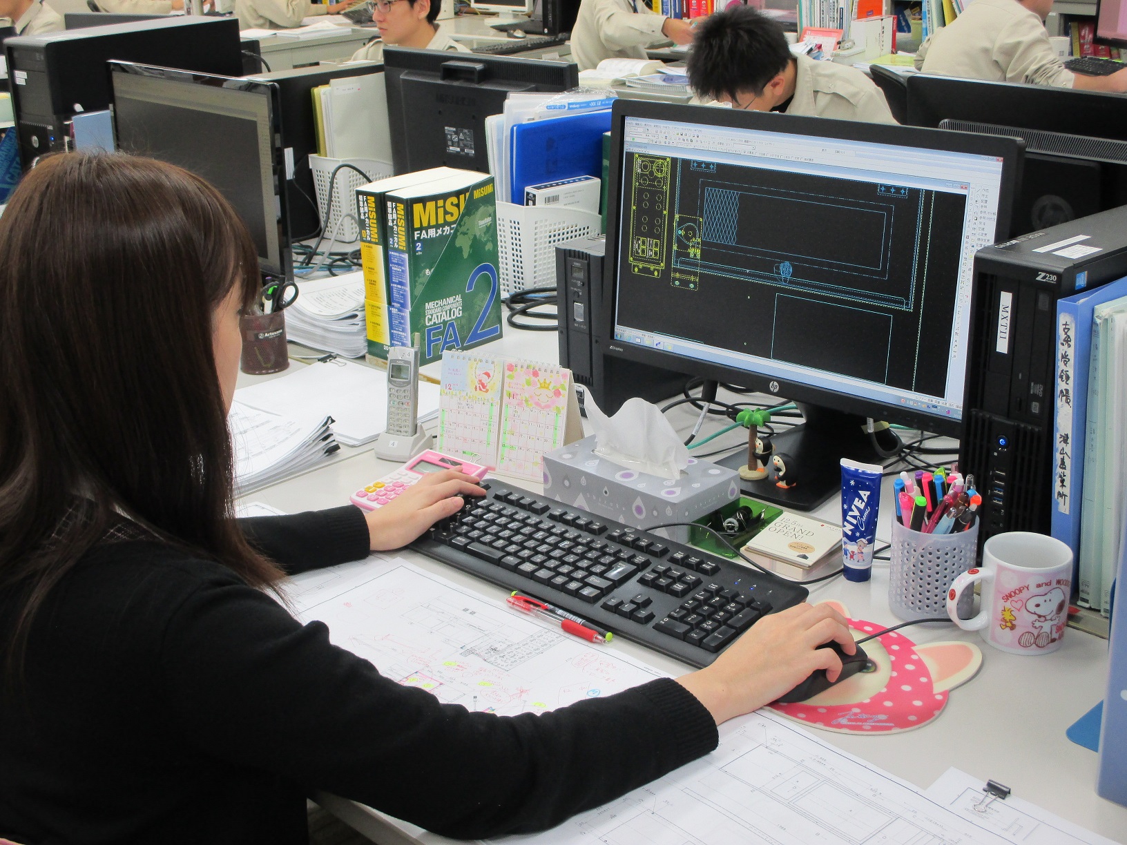 業務形態は、社内での「設計請負業務」を基本にしており、あらゆる分野のお客様のニーズに対応し、構想図や計画図等の難易度の高い技術にも対応できる陣容(保有CAD約220台)で、機械設計のプロフェッショナルとしてお客様からの信頼を得ています。