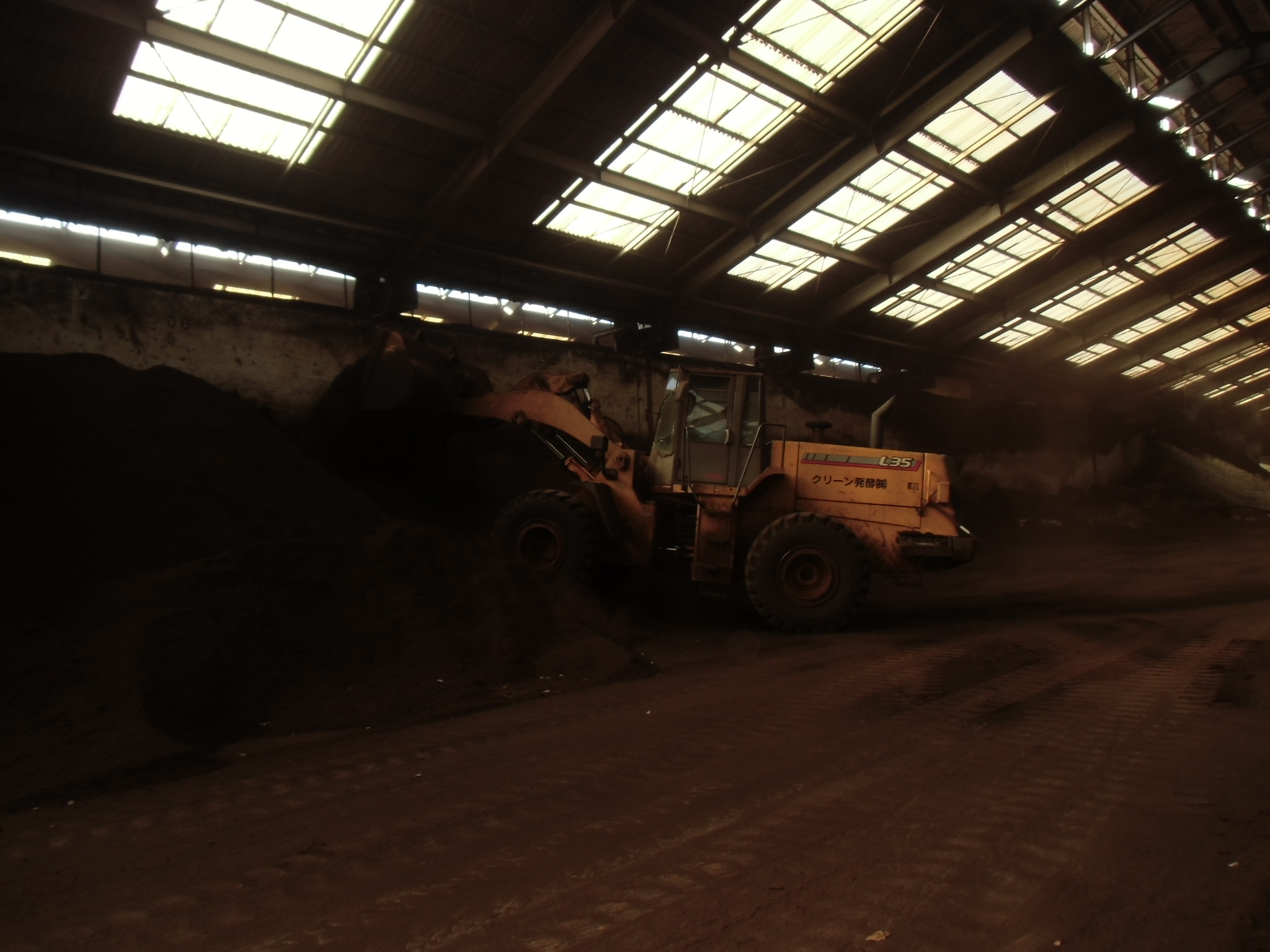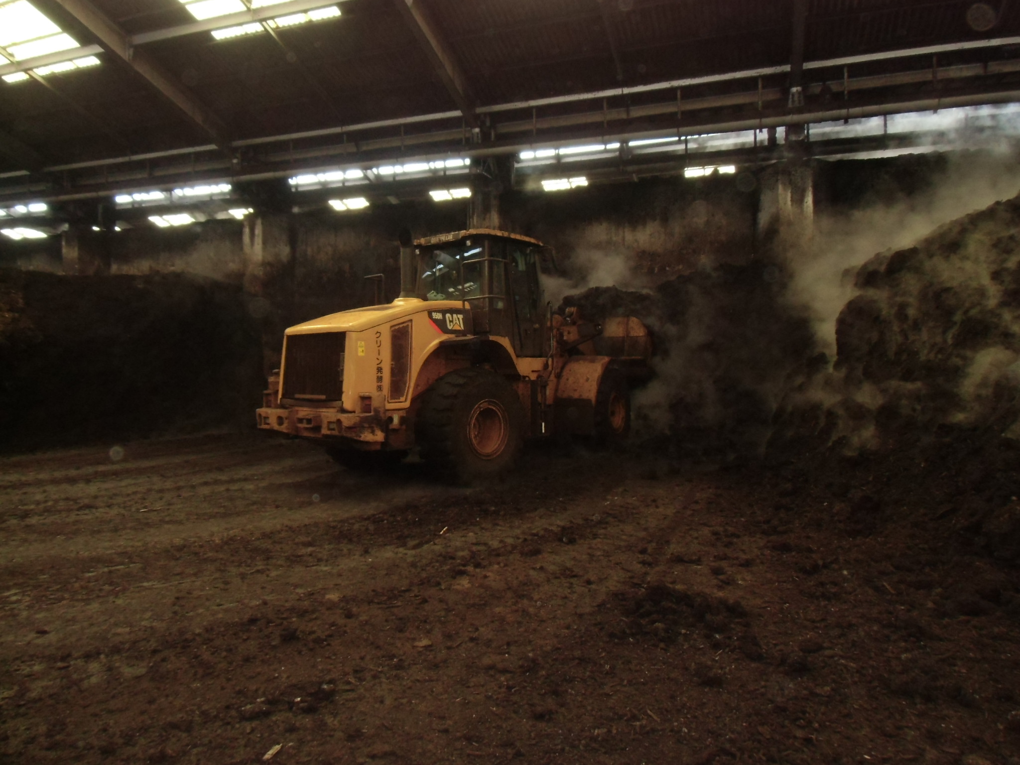・肥料生産工程によるホイルーローダーでの堆肥の切返しや篩い作業