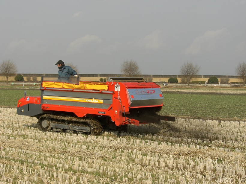 我社の製品クリーンユーキ(有機質肥料)は有機100%。有機質成分が土中で発揮され、土壌をやわらかくし、肥効を下げない豊かな土壌へと改良されていきます。安全で安心な有機質肥料です。広い圃場には農家の方に気軽に使用して頂く為、散布も行なっています。