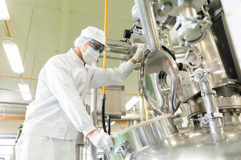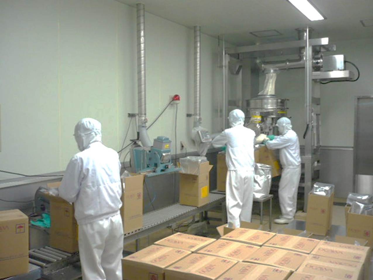 工場では、研究所で開発された「香り」「味」を、その担当研究所からの情報や処方(レシピ)指示により、生産するという、最終段階の重要な役割を担っています。香料の生産に使う原料とは、粉末スープやチューインガムなどには粉末形態のもの、液体の商品(ジュース、アイスクリームなど)や香水などには液体のものが一般的です。例えば粉末なら、油性の香気成分と賦形剤というものを混ぜてそれを粉にする専用の機械「スプレードライヤー」を使うなど、様々な特殊設備を用いて生産を行っています。